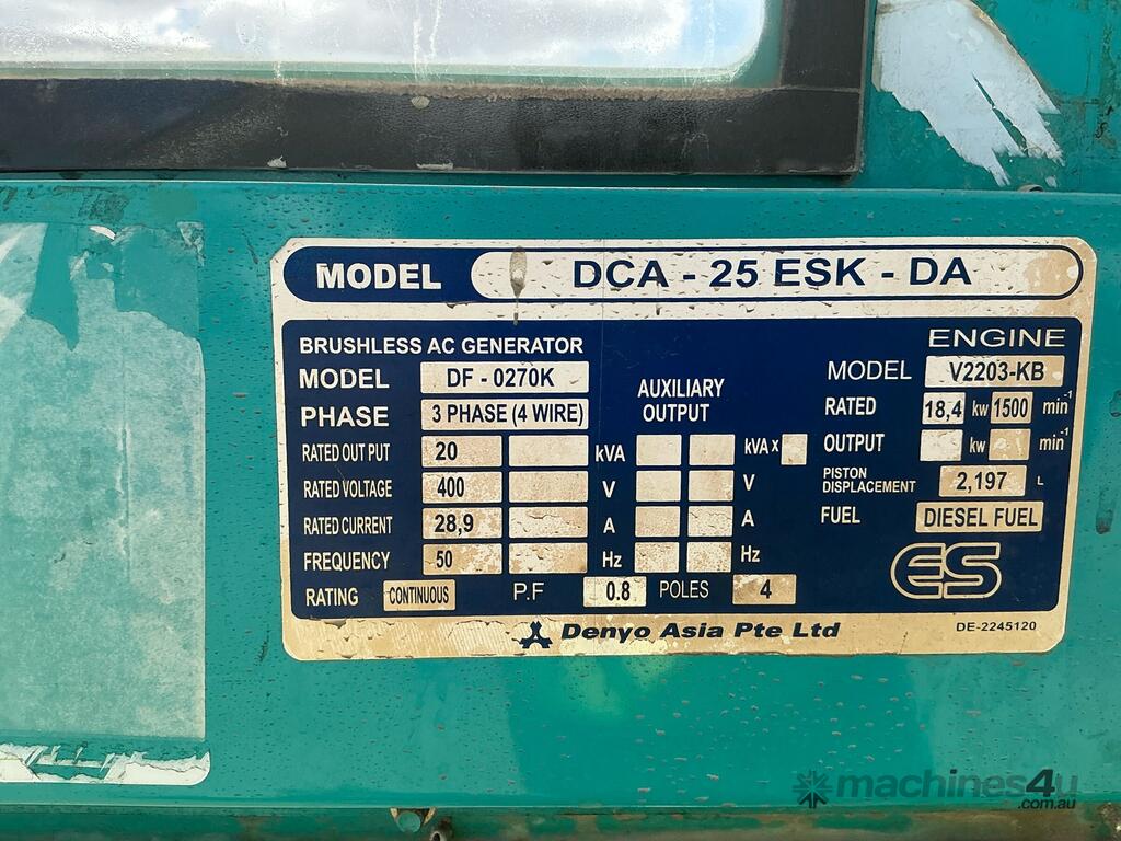 CP: CIRCA 2011,Denyo,DCA 25 ESK,Generator,4 Cyl,Diesel,Odometer not visible,8496 (Hrs. Showing on Hour meter),Colour: Green,Unregistered,VIN: 6T9T22V97803C8007,Serial No: 1031597,Sold with No Plates