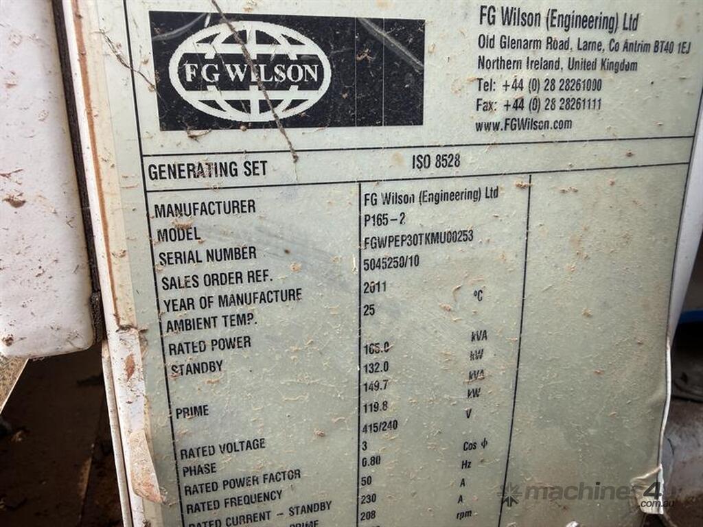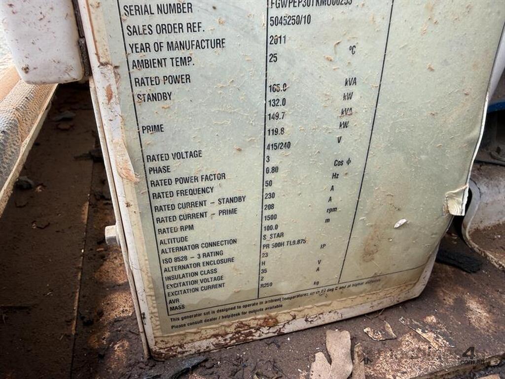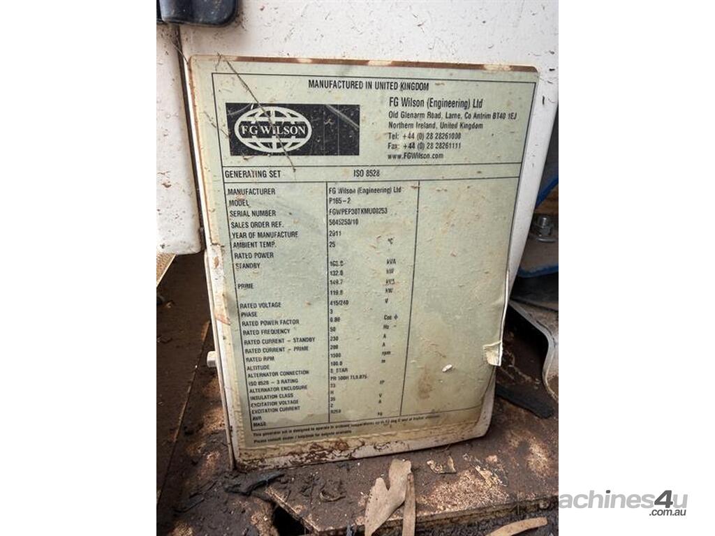 2011 FG WILSON P KVA GENERATOR, S/N: FGWPEP30TKMU00253, E/N: ###, 10,158 HOURS SHOWING. LOCATION: HALFERTY STREET, EMERALD, QLD 4720. INSPECTIONS & COLLECTIONS: MONDAY TO FRIDAY, 8AM TO 4PM. ENQUIRIES: RYAN OGDEN BROWN ON OR RYANEMERALDAUCTIONCENTRE