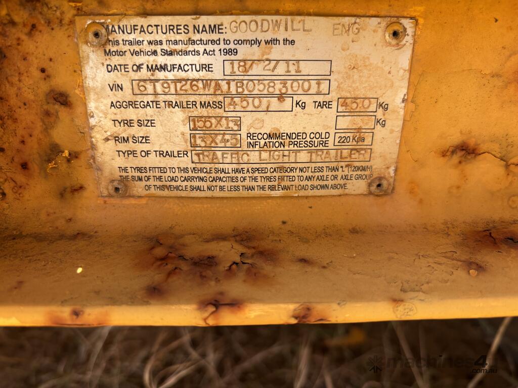 CP: 02/2011,Built: 02/2011,Good Will Engineering,Single Axle Traffic Light Trailer,0 (undefined),Colour: Yellow,Rego. No: GG12534 WA,Rego expiry: 30/06/2026,VIN: 6T9T26WA1B0583001,Plates to All