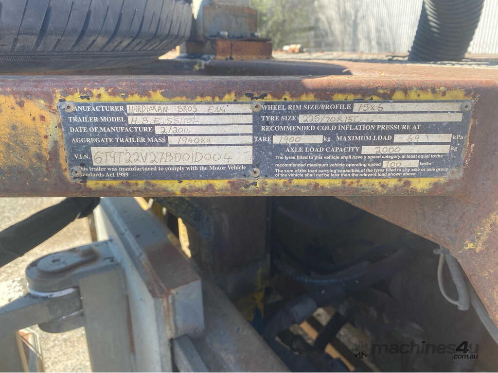 CP: 02/2011,Hardiman Bro's Engineering,H.B.E SS1107,Trailer Mounted Sweeping System,0 (undefined),Rego. No: NP(B65786), Unregistered,VIN: 6T9T22V27B001D004,Sold with No Plates