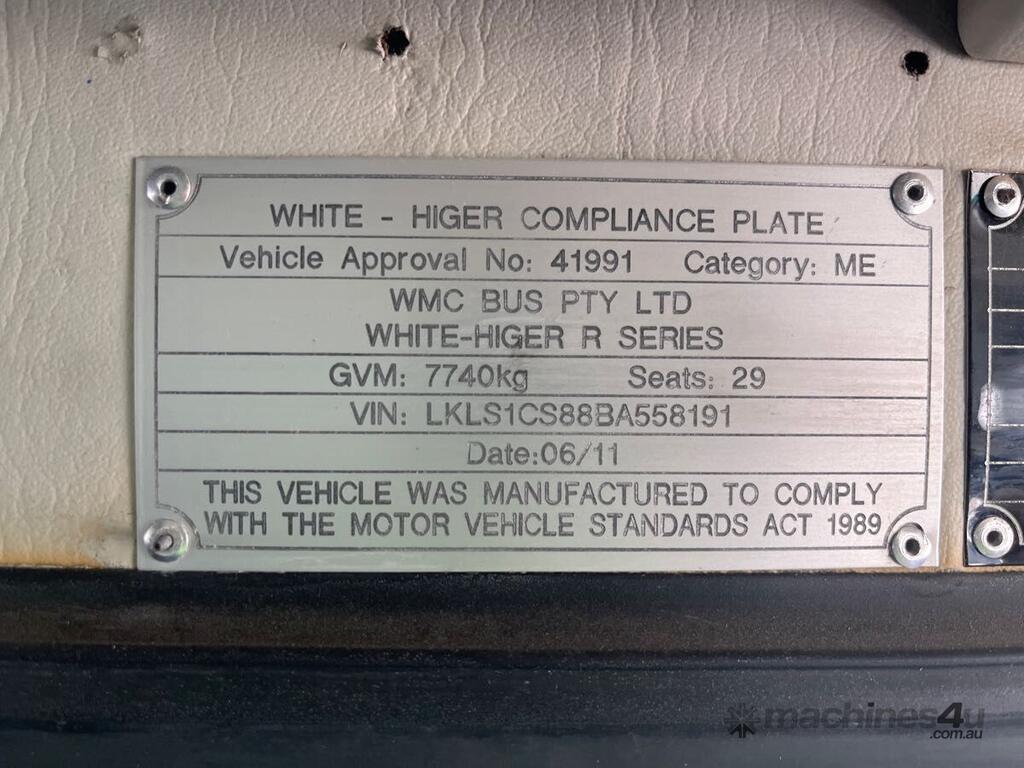 CP: 06/2011,Higer,R-Series,Bus,Automatic,Leaf Spring,4 Cyl,Diesel,256664 (Kms. Showing on Odometer),Hourmeter not visible,Colour: White,Unregistered,VIN: LKLS1CS88BA558191,Key No: P97,Length: 7.2 m,GVM: 7740,Sold with No Plates,Key No: P97