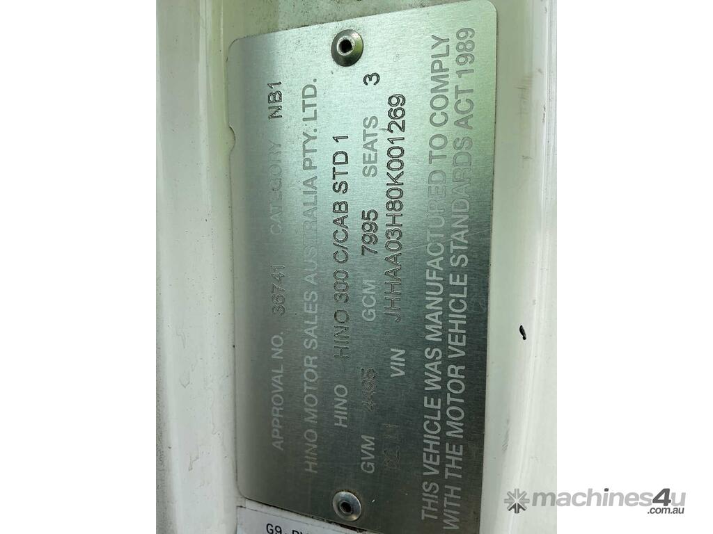 CP: 02/2011,Hino,300 614,Tipper,Manual,Spring,Engine #: N04CTB21039,4 Cyl,Diesel Turbo,5 Gears,146744 (Kms. Showing on Odometer),Hourmeter not visible,Colour: White,Rego. No: BK78QV NSW,Rego expiry: 09/05/2026,VIN: JHHAA03H80K001269,Key No: 599S,Length: 4.8 m,GVM: 4495,GCM: 7995,Sold with No Plates,Key No: 599S