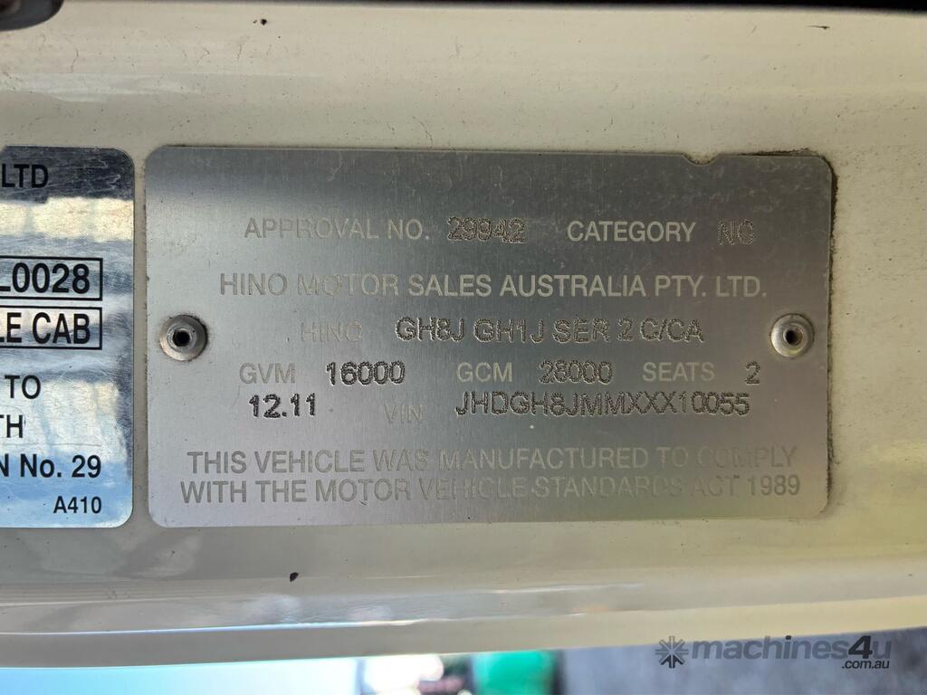 CP: 12/2011,Hino,GH 500 1728,Tipper,Automatic,Airbag,6 Cyl,Diesel,160361 (Kms. Showing on Odometer),Hourmeter not visible,Colour: White,Unregistered,VIN: JHDGH8JMMXXX10055,Key No: 51,GVM: 16000,GCM: 28000,Sold with No Plates,Key No: 51