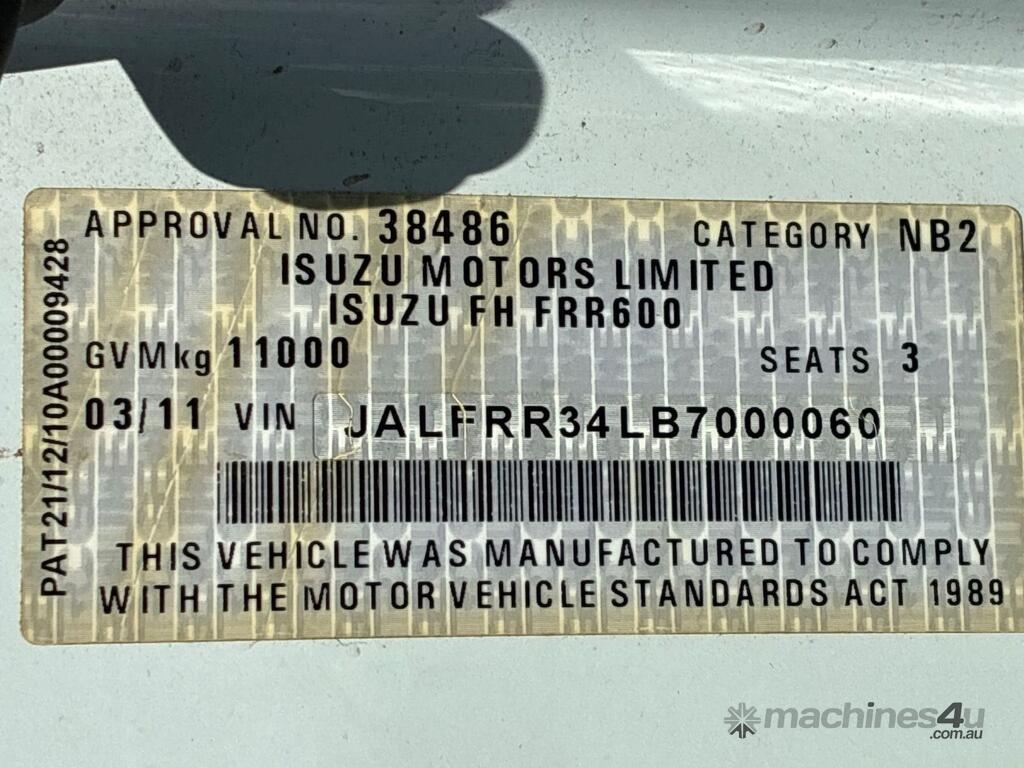 CP: 03/2011,Isuzu,FRR600,Table Top,Automatic,Spring,Engine #: 6HK1605772,6HK1,6 Cyl,Diesel Turbo,55698 (Kms. Showing on Odometer),3826 (Hrs. Showing on Hour meter),Colour: White,Unregistered,VIN: JALFRR34LB7000060,Key No: 171,Length: 7.4 m,GVM: 11000,GCM: 16000,Sold with No Plates,Key No: 171