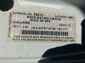 CP: 10/2011,Isuzu,NPR200,Tipper,Manual,Spring,4 Cyl,Diesel,Turbo,5 Gears,47988 (Kms. Showing on Odometer),Hourmeter not visible,Colour: White,Rego. No: NP(DO01LP), Unregistered NSW,VIN: JAANPR75FB7100177,GVM: 4500,GCM: 8000,Sold with No Plates