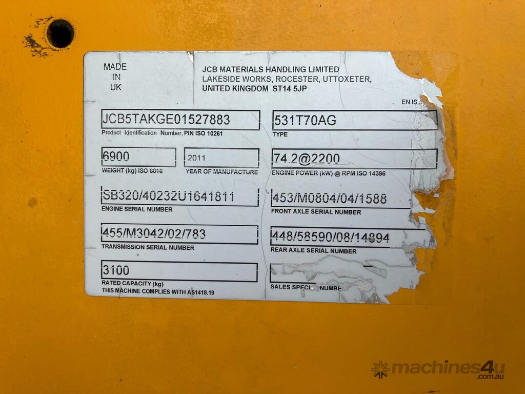 CP: CIRCA 2011,JCB,531-70 Agri,Telehandler,Engine #: U164811,4 Cyl,Diesel,Odometer not visible,3421 (Hrs. Showing on Hour meter),Colour: Yellow,Rego. No: NP(04272C), Unregistered NSW,Chassis: JCB5TAKGE01527883,Serial No: JCB5TAKGE01527883,ROPS No: undefined,FOPS No: undefined,Sold with No Plates,WOVR Status: WOVR N/A,Incident Type: Not Applicable