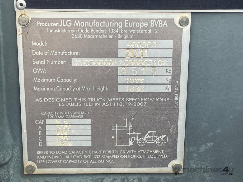 CP: CIRCA 2011,JLG,4009PS,Telehandler,4 Cyl,Diesel,Odometer not visible,4755 (Hrs. Showing on Hour meter),Colour: Orange,Unregistered QLD,Serial No: YC06318,Sold with No Plates,Key No: M10