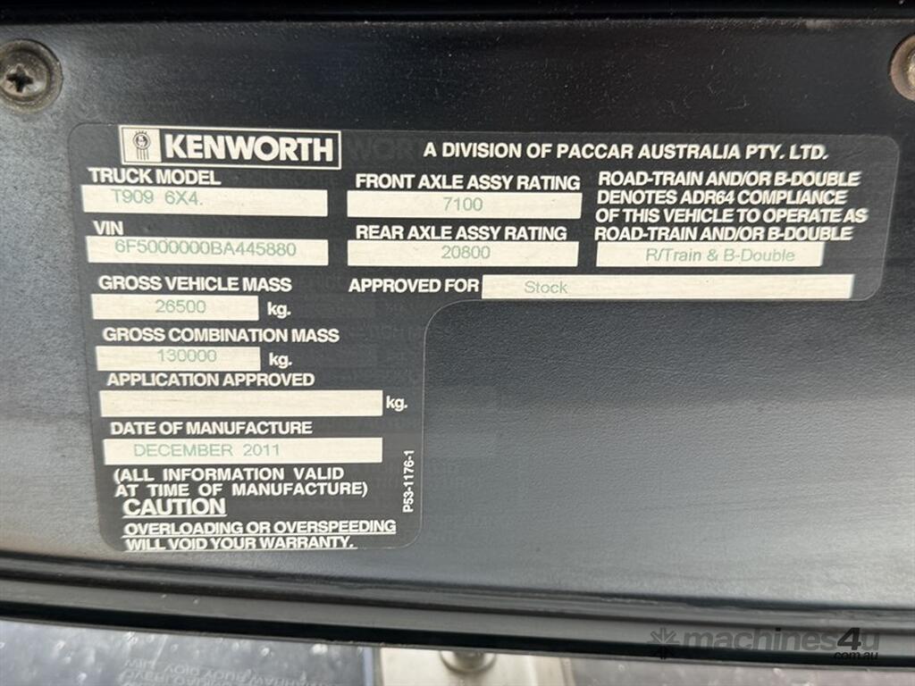 2011 KENWORTH T909 PRIME MOVER, VIN: 6F5000000BA445880, E/N: 79450451, 960,550 KM SHOWING, 10,018 HOURS SHOWING, REGISTRATION EXPIRES 14/05/2027, COI EXPIRES 13/02/2027. LOCATION: HALFERTY STREET, EMERALD, QLD 4720. INSPECTIONS & COLLECTIONS: MONDAY TO FRIDAY, 8AM TO 4PM. ENQUIRIES: CAMERON BENSLEY ON OR CAMERONEMERALDAUCTIONCENTRE