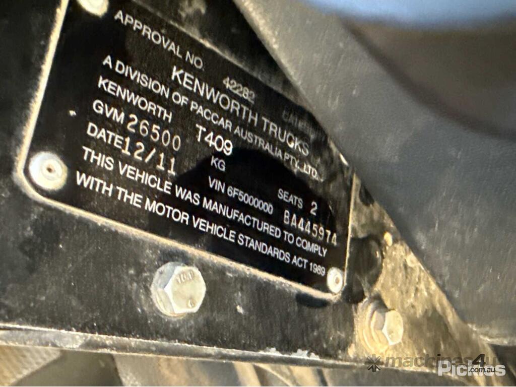 CP: 12/2011,Kenworth,T409,Tipper,Manual,Air Bag Suspension,Engine #: 79649732,Cummins ISX ADR 80/03,Diesel Turbo,18 Gears,977119 (Kms. Showing on Odometer),Hourmeter not visible,Colour: White,Rego. No: JMS049 NSW,VIN: 6F5000000BA445974,GVM: 26500,GCM: 80000,Sold with No Plates