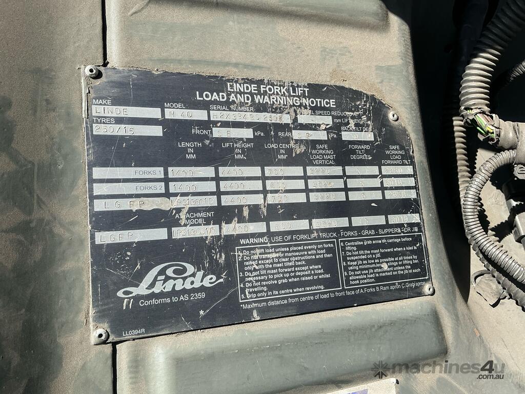 CP: 01/2011,Built: 01/2011,Linde,H40,Forklift,LPG only,Odometer not visible,5865 (Hrs. Showing on Hour meter),Colour: Orange,Unregistered,Serial No: H2X394B02508,Sold with No Plates