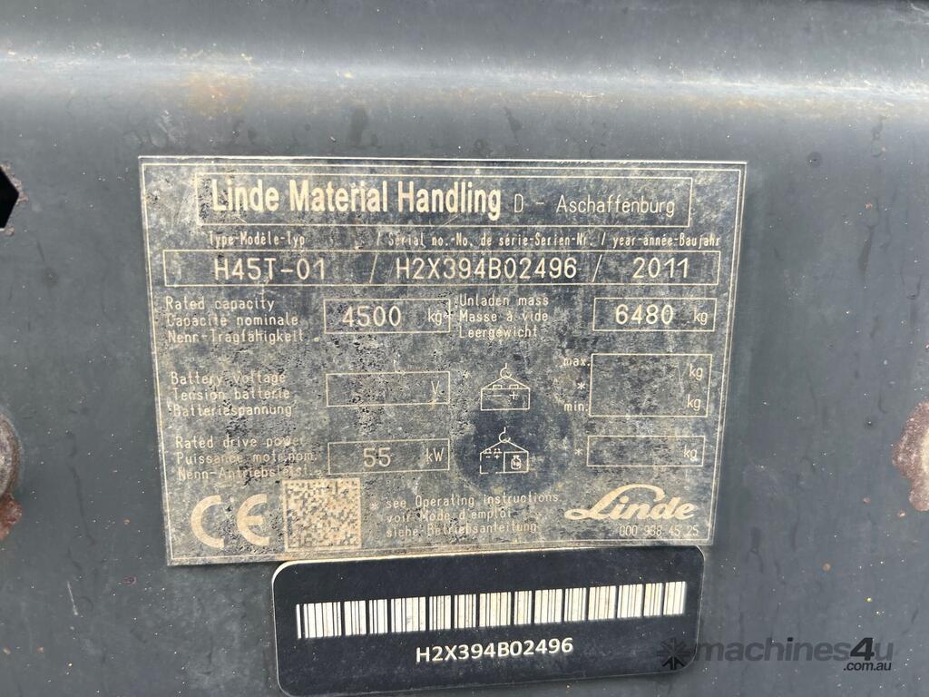 CP: CIRCA 2011,Linde,H45T,Forklift,LPG only,Odometer not visible,12036 (Hrs. Showing on Hour meter),Colour: Red,Unregistered,Serial No: H2X394B02496,Sold with No Plates,Key No: 330