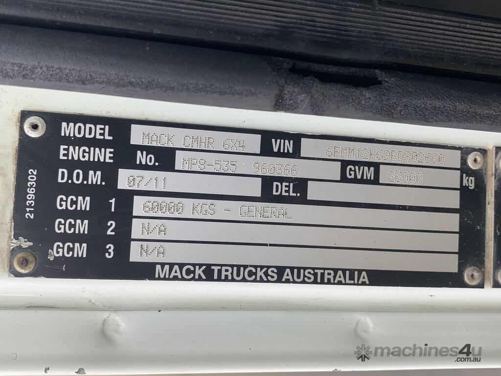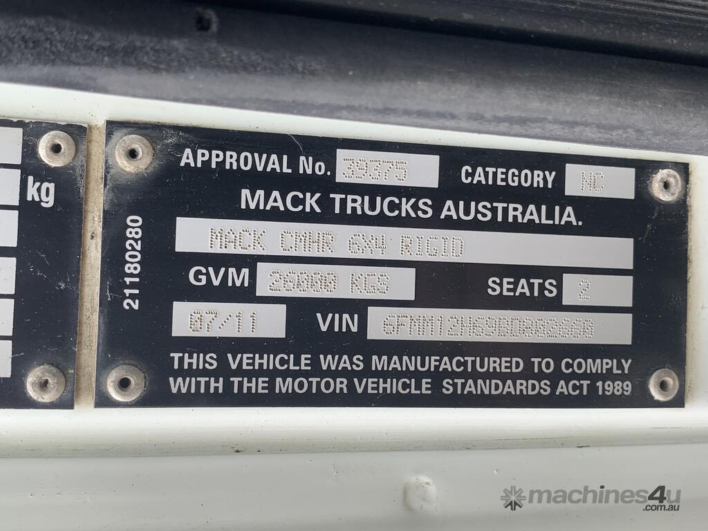 CP: 07/2011,Mack,CMHR Trident,Tipper,Automatic,Air Bag Suspension ,Engine #: MP,MP8 ,6 Cyl,Diesel Turbo,1001709 (Kms. Showing on Odometer),23615 (Hrs. Showing on Hour meter),Colour: White,Unregistered,VIN: 6FMM12H69BD802660,GVM: 26000,GCM: 60000,Sold with No Plates