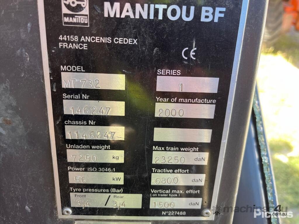 CP: CIRCA 2011,Manitou,MT732,Telehandler,4 Cyl,Diesel,Odometer not visible,3184 (Hrs. Showing on Hour meter),Rego. No: APS230 SA,Serial No: 1146247,Sold with No Plates,WOVR Status: WOVR N/A,Incident Type: Impact