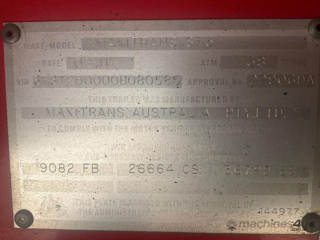 CP: 02/2011,Built: 02/2011,Maxitrans,ST3,Tri Axle Flat Top A Trailer,Hubometer not visible,Colour: Blue,Rego. No: NP(YV30DU), Unregistered NAT,VIN: 6F8T250000B080585,Sold with No Plates