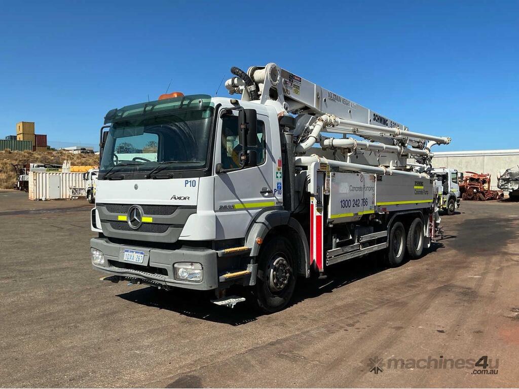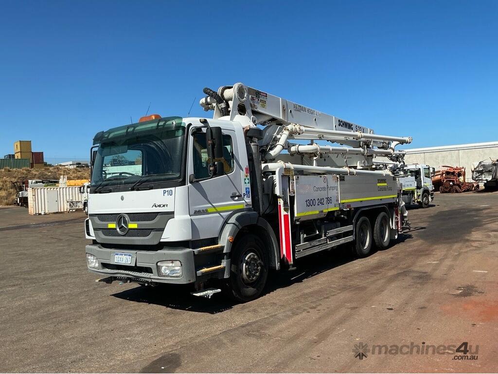 CP: 08/2011,Mercedes Benz,Axor 2633,Concrete Pump Truck,Automated Manual Transmission,Leaf Spring Suspension ,6 Cyl,Diesel,313955 (Kms. Showing on Odometer),19291 (Hrs. Showing on Hour meter),Colour: White,Rego. No: 1DXA267 WA,Rego expiry: 19/04/2026,VIN: WDB9506432L588703,Key No: 16 R,Length: 10.8 m,GVM: 27500,GCM: 31900,Plates to All,Key No: 16 R