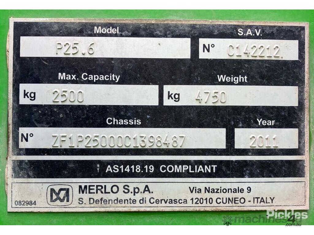 CP: CIRCA 2011,Merlo,P25.6,Telehandler,4 Cyl,Diesel,Odometer not visible,5700 (Hrs. Showing on Hour meter),Colour: Green,Unregistered,Serial No: ZF1P25000C1398487,ROPS No: undefined,FOPS No: undefined,Sold with No Plates
