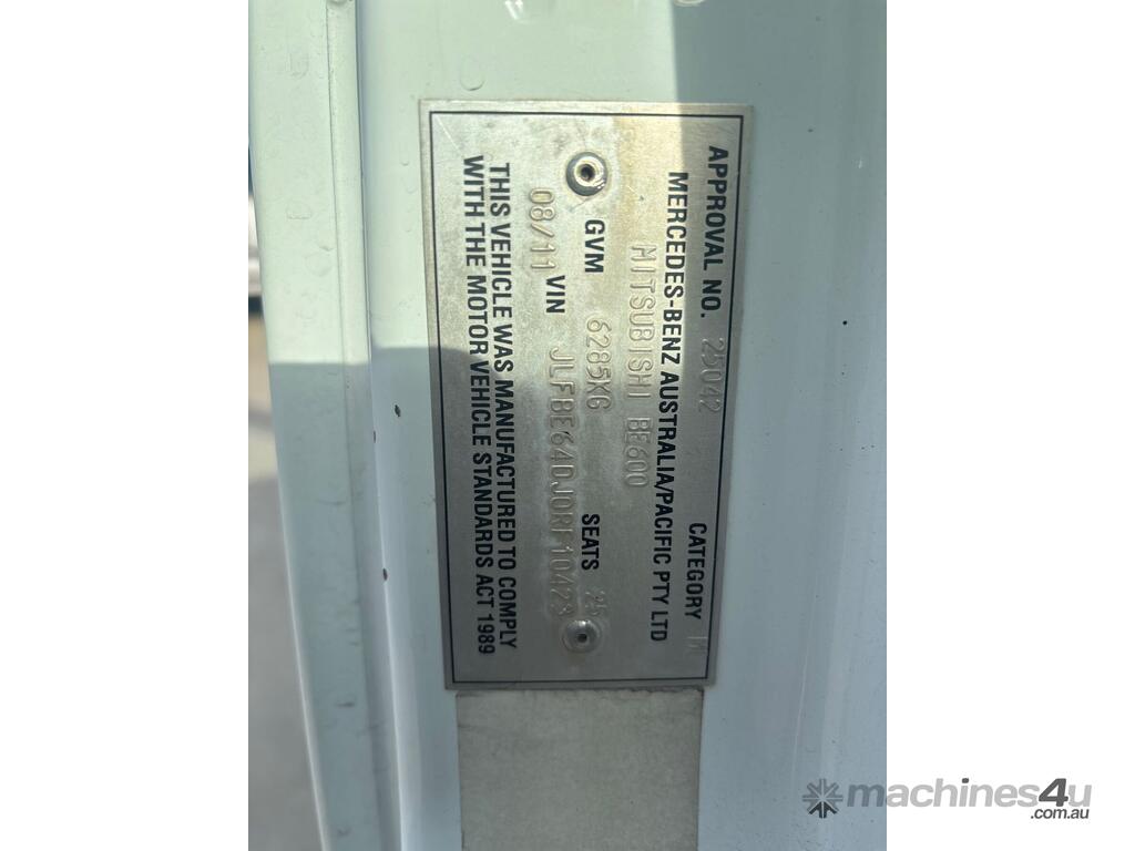 CP: 08/2011,Mitsubishi,BE600,23 Seat Bus,Automatic,Spring ,Engine #: 4M50D68756,Mitsubishi Fuso 4M50,4 Cyl,Diesel Turbo,158034 (Kms. Showing on Odometer),Hourmeter not visible,Colour: White,Rego. No: NP(C76HV), Unregistered TAS,VIN: JLFBE64DJ0RF10423,Length: 7.8 undefined,GVM: 6285,Sold with No Plates