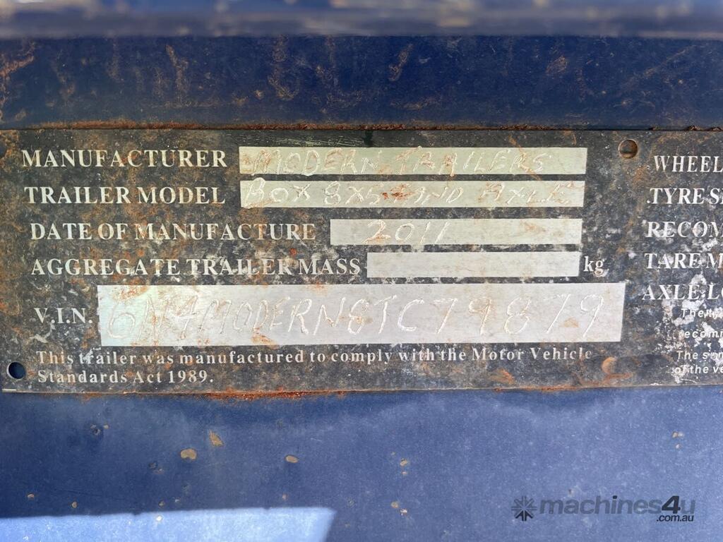 CP: CIRCA 2011,Modern Trailers,8x5 Box Trailer,Tandem Axle Box Trailer,Hubometer not visible,Colour: Blue,Rego. No: NP(TF77SR), Unregistered NSW,VIN: 6N4M0DERN8TC79879,Serial No: 6N4M0DERN8TC79879,Sold with No Plates