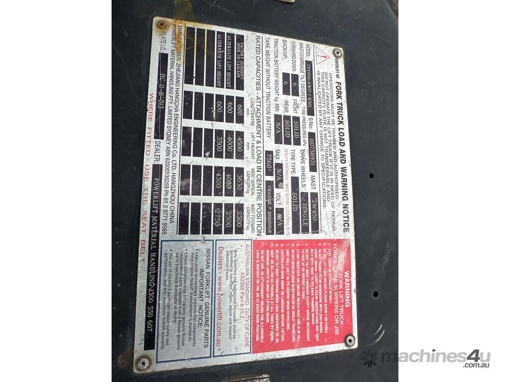 CP: CIRCA 2011,Powerlift,CPYD50-RW17,2 Stage Forklift,6 Cyl,Petrol & LPG (Dual),Odometer not visible,8704 (Hrs. Showing on Hour meter),Colour: Red,Unregistered,Serial No: ,ROPS No: undefined,FOPS No: undefined,Sold with No Plates,Key No: 13