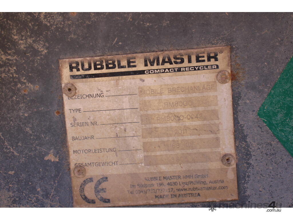 Mobile Tracked Impact Crusher, Make: Rubble Master, Model: RM80GO, DOM: 2011, Serial: RM80GO-0042, Hourmeter: Advised 1,602 Hrs, Nominal Power: 168kW, Approx Weight: 23.6T, Operational: Yes, with Pallet of Spares.