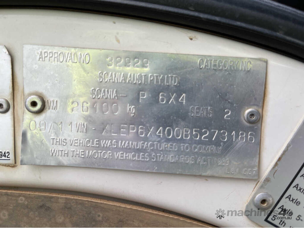CP: 09/2011,Scania,P320,Water Cart,Manual,Leaf Spring Suspension ,6 Cyl,Diesel Turbo,6 Gears,234268 (Kms. Showing on Odometer),7259 (Hrs. Showing on Hour meter),Colour: White,Rego. No: XP36IW NSW,Rego expiry: 06/12/2026,VIN: XLEP6X400B5273186,Length: 7.5 m,GVM: 26100,GCM: 45000,Sold with No Plates