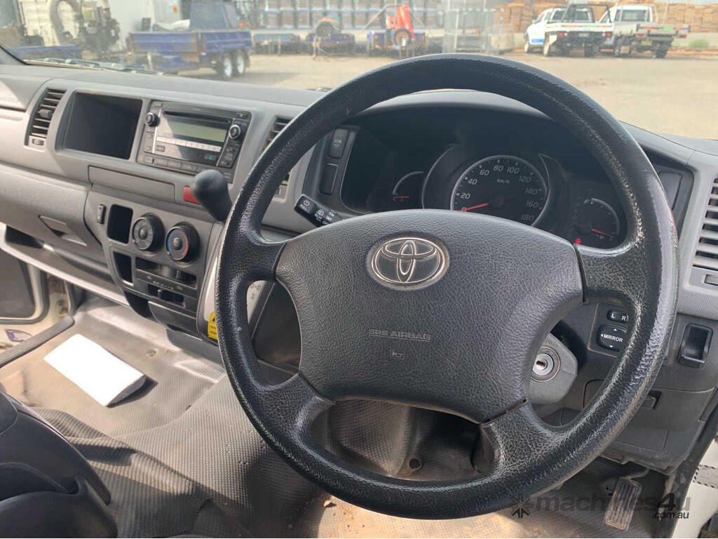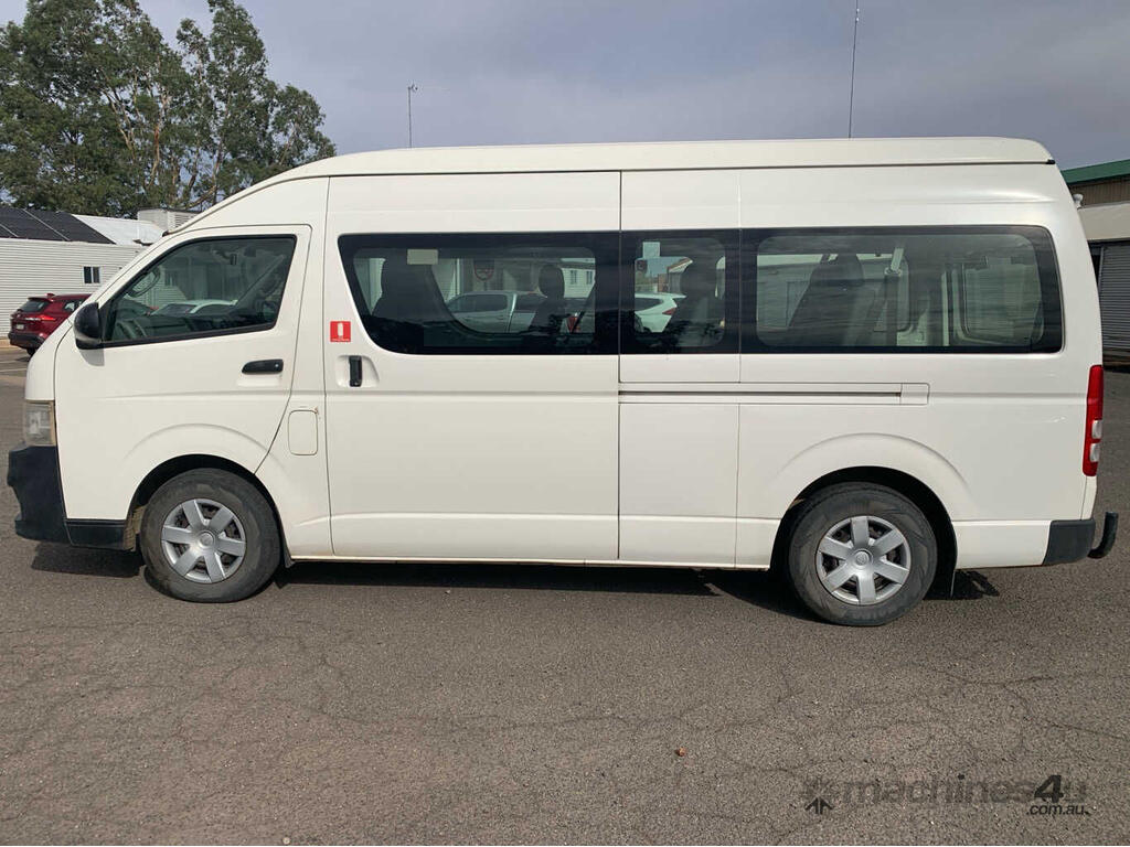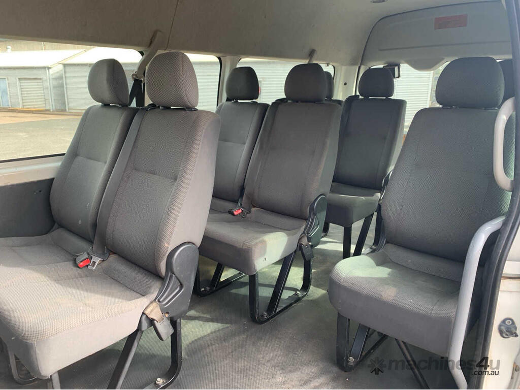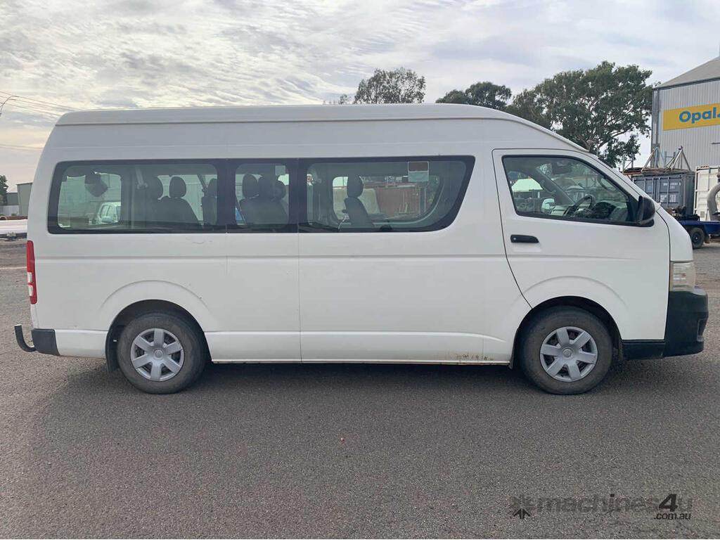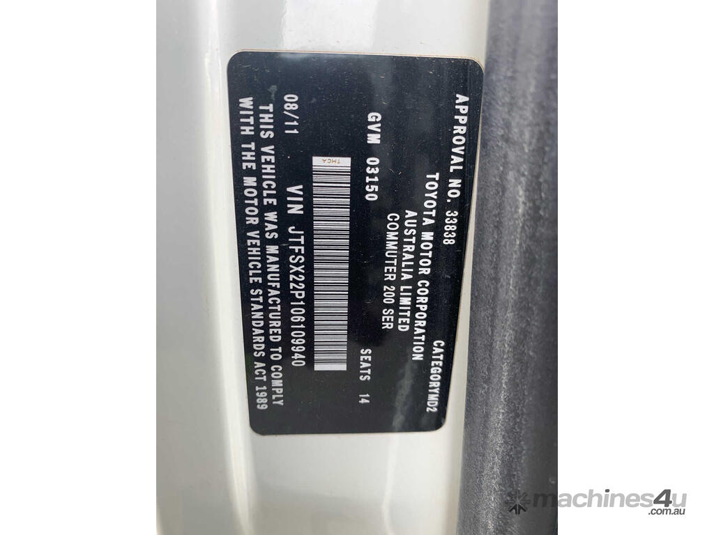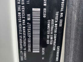 CP: 08/2011,Built: 07/2011,Toyota,Hiace,TRH223R MY11 Commuter,Bus,10 seats,5 doors,Automatic,Engine #: 2TR1040782,2.7 Ltr,4 Cyl,Petrol - Unleaded ULP,Multi-Point Injection,4 Gears,269136 (Kms. Showing on Odometer),Colour: White,Rego. No: NP(YPT059), Unregistered VIC,VIN: JTFSX22P,Sold with No Plates