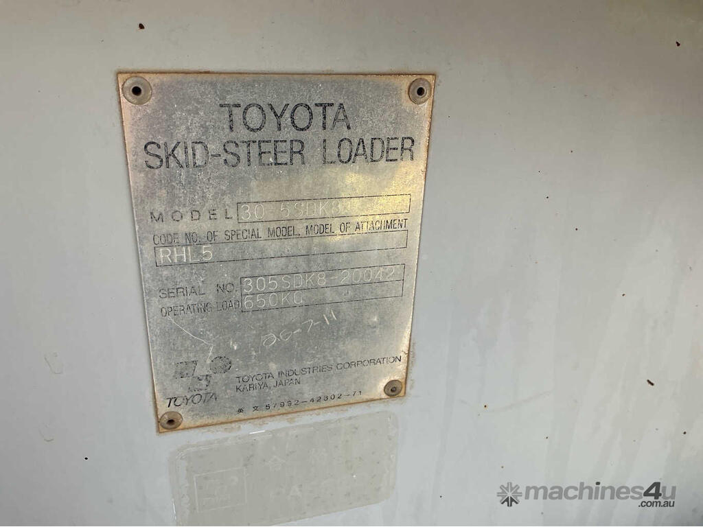CP: CIRCA 2011,Toyota,Huski 30-5SDK8,Wheeled Skid Steer,4 Cyl,Diesel,Odometer not visible,3433 (Hrs. Showing on Hour meter),Colour: Grey,Unregistered,Serial No: 305SDK8-2004.2,Sold with No Plates