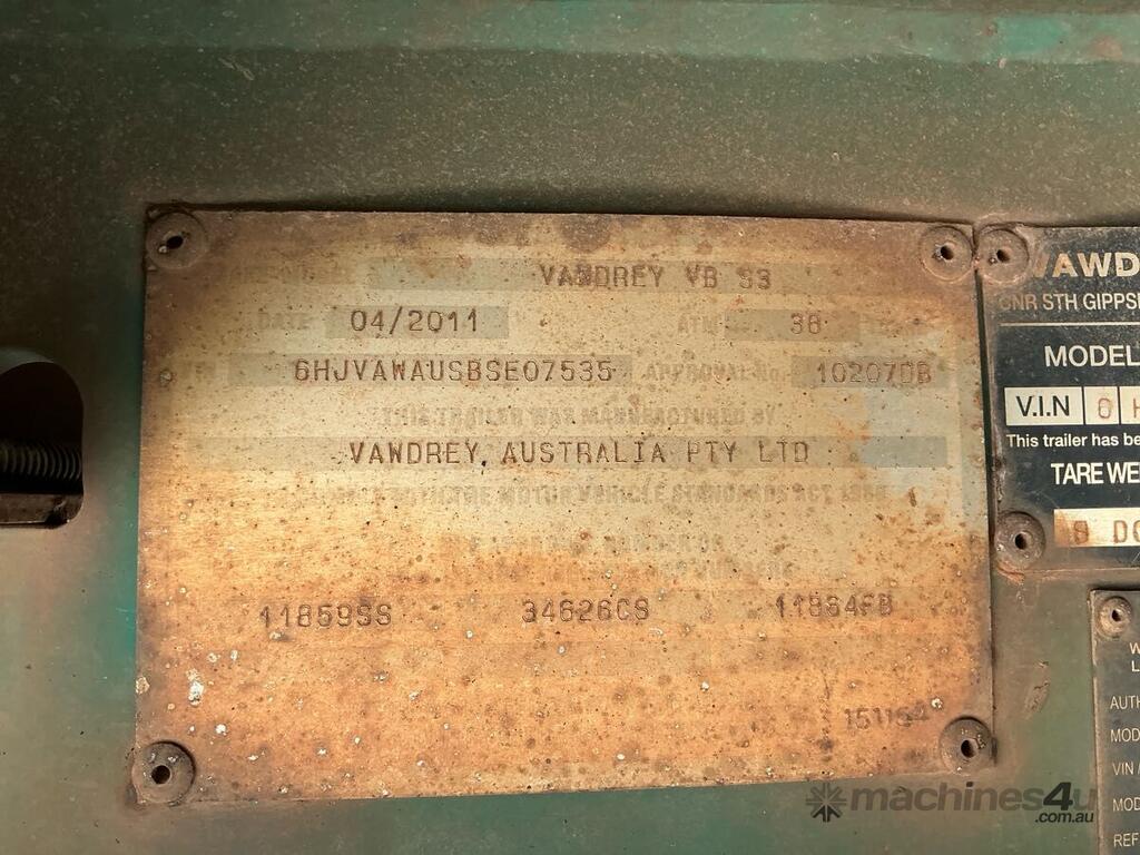 CP: 04/2011,Vawdrey,VB S3,Curtainsider Tri Axle Trailer,1926847 (Kms. Showing on Hubometer),Colour: White,Rego. No: NP(1TLX175), Unregistered WA,VIN: 6HJVAWAUSBSE07535,Sold with No Plates