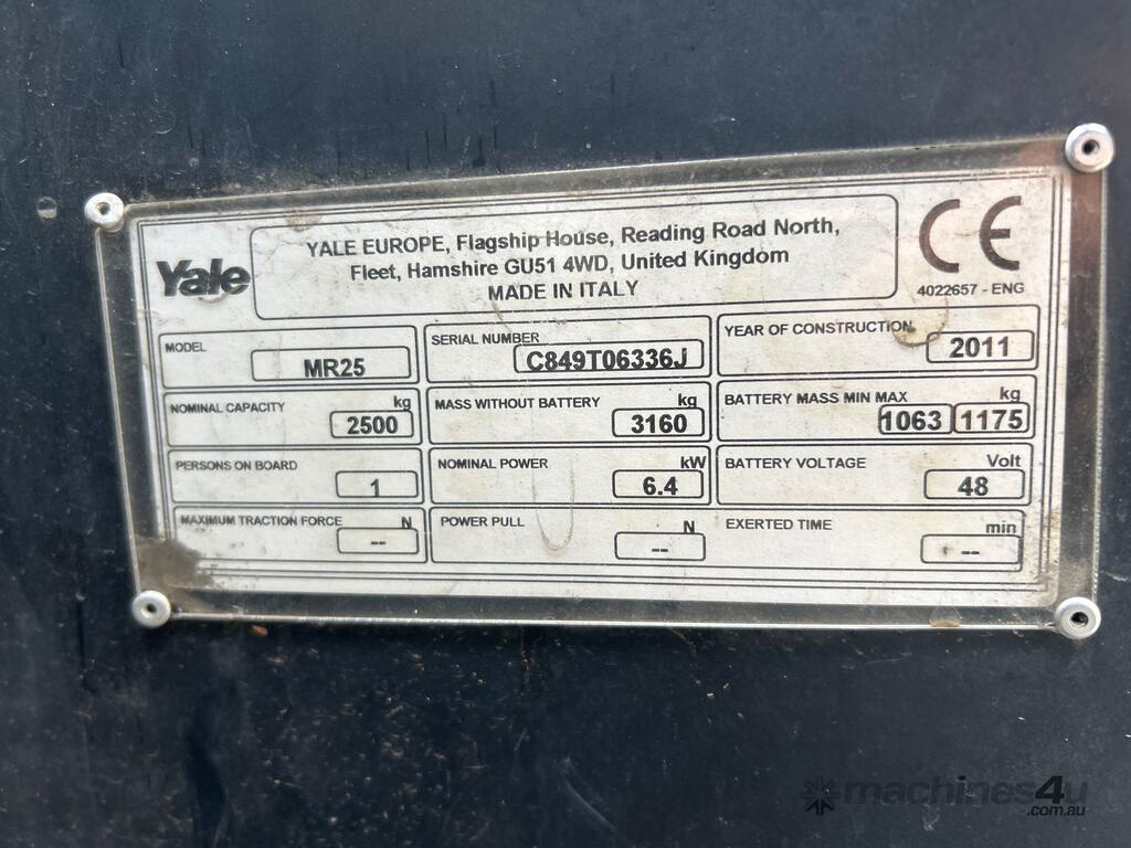 CP: CIRCA 2011,Yale,MR25,Forklift,Electric,Odometer not visible,2471 (Hrs. Showing on Hour meter),Colour: Yellow,Unregistered,Serial No: C849T06336J,Sold with No Plates,Key No: 361