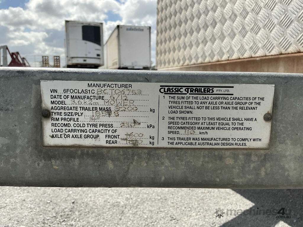 CP: 06/2012,Classic Trailers,Tandem Axle Plant Trailer,Hubometer not visible,Colour: Silver,Rego. No: NP(X95079), Unregistered NSW,VIN: 6F0CLAS1CBCT06753,Sold with No Plates
