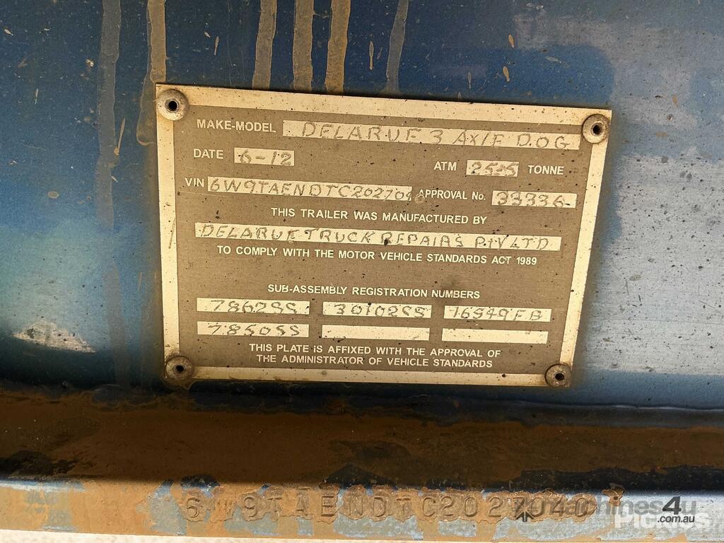CP: 06/2012,Built: 06/2012,Delarue,3 Axle Dog,Tri Axle Tipping Dog Trailer,Hubometer not visible,Colour: White,Rego. No: YO59AI NSW,VIN: 6W9TAENDTC2027040,Sold with No Plates