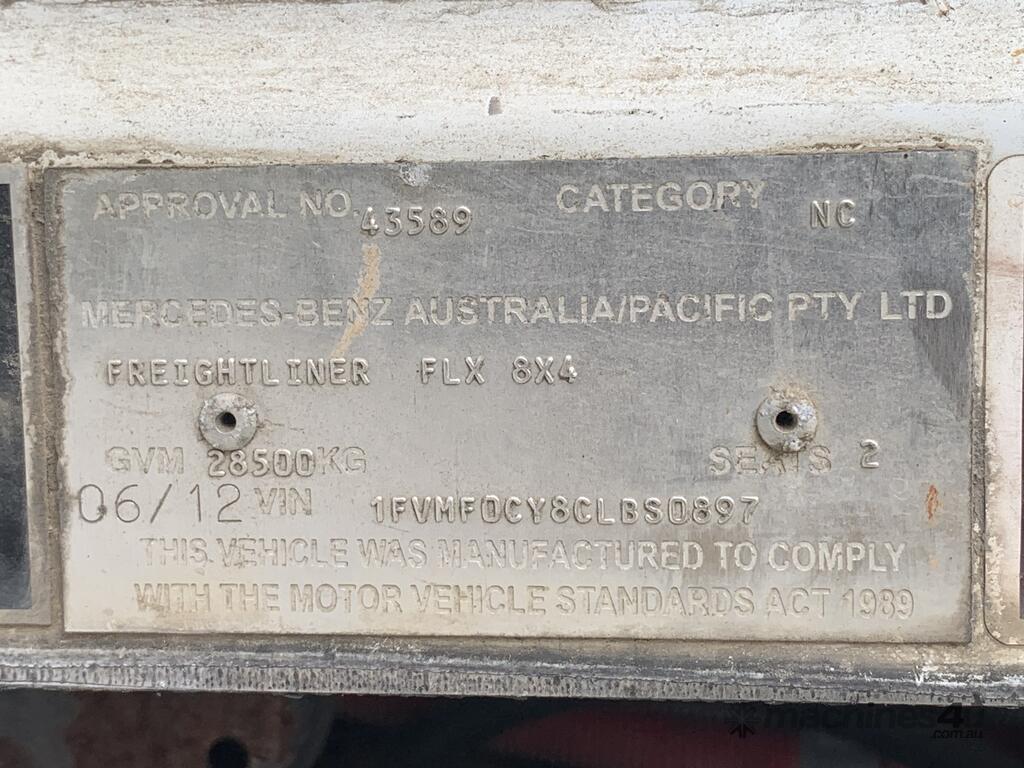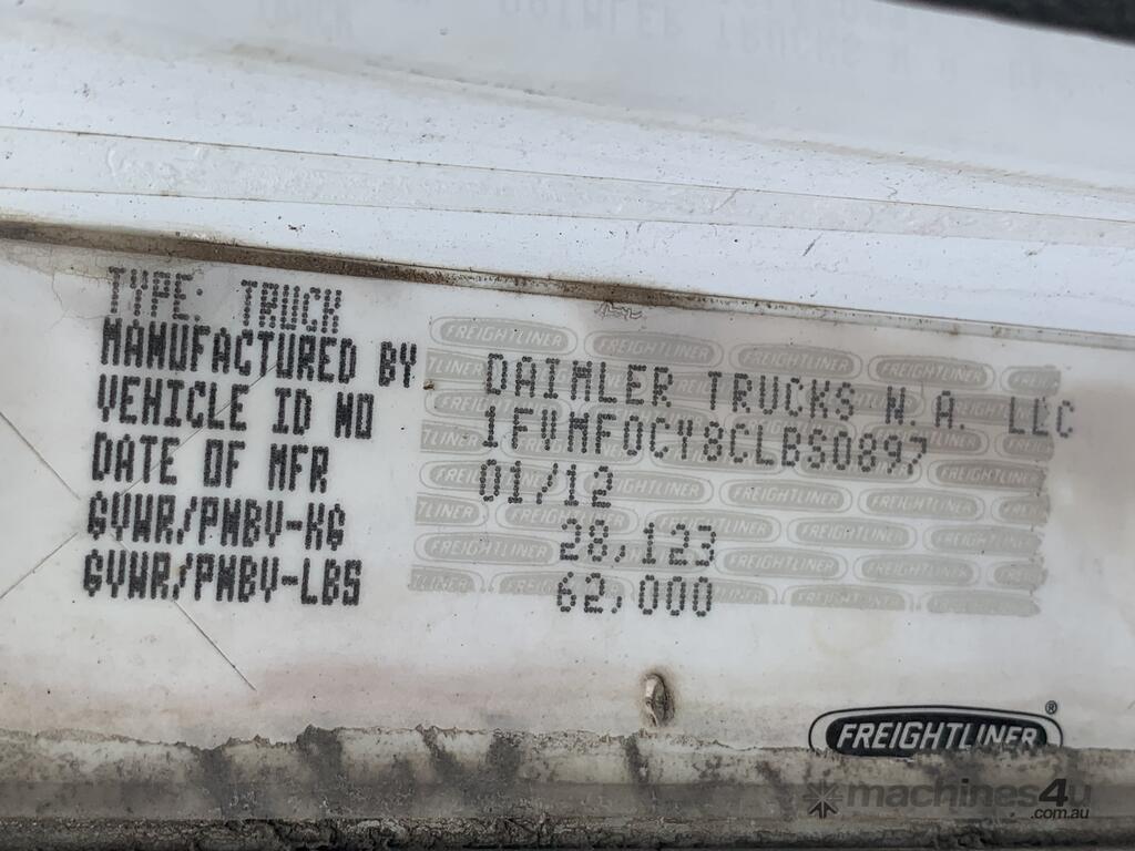 CP: 06/2012,Built: 01/2012,Freightliner,Century Class FLX C112,Cab Chassis,Automatic,Airbag Suspension,Cummins,6 Cyl,Diesel Turbo,281694 (Kms. Showing on Odometer),2506 (Hrs. Showing on Hour meter),Unregistered,VIN: 1FVMF0CY8CLBS0897,GVM: 28500,GCM: 28500,Sold with No Plates