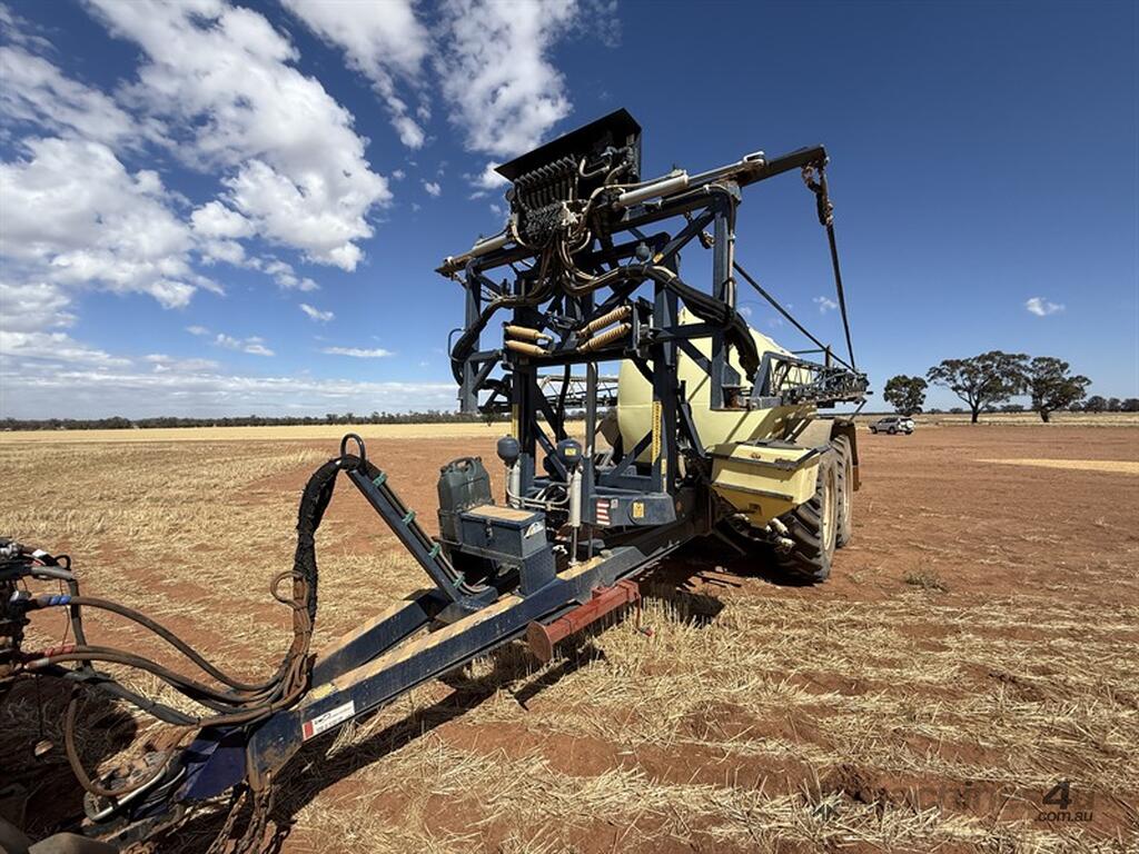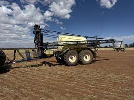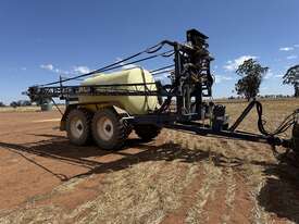 2012 Hayes 36m Boom Spray, Serial Number: HS-BT0120817. Equipped with an 8,000lt poly tank mounted on a bogie axle with spring suspension. Boom folds hydraulically to approximately 24m. Features include hydraulic boom lift and fold, hydraulic pump operation, and a hydraulic adjustable hitch. The boom fitted with double shock absorbers and new seals recently replaced in the spray pump. Boom wings have breakaway end sections for added protection. Spray system includes a single nozzle system with dual nozzles