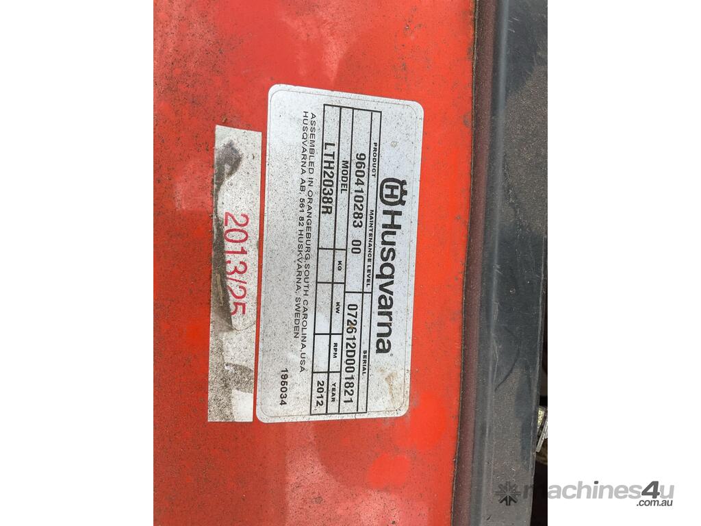 CP: CIRCA 2012,Husqvarna,Ride On Mower,Odometer not visible,Hourmeter not visible,Colour: Orange,Unregistered,Serial No: 072612D001821,Sold with No Plates,WOVR Status: WOVR N/A,Incident Type: Not Applicable
