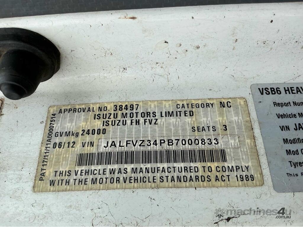 CP: 06/2012,Isuzu,FH,Cab Chassis,Manual,Engine #: 6HK1-625529,Diesel,Odometer not visible,Hourmeter not visible,Colour: White,Rego. No: NP(ZFW779), Unregistered VIC,VIN: JALFVZ34PB7000833,Length: 27 ft,GVM: 24000,GCM: 36000,Sold with No Plates,WOVR Status: WOVR N/A