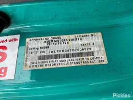 CP: 10/2012,Isuzu,FH,Curtain Sider,Automatic,Diesel,492131 (Kms. Showing on Odometer),Hourmeter not visible,Colour: Green,Rego. No: NP(ZKK965), Unregistered,VIN: JALFVR347B7000679,Length: 29 ft,GVM: 16500,GCM: 32000,Sold with No Plates