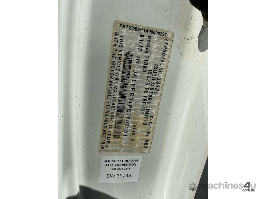 CP: 01/2012,Isuzu,FRR600 LWB Premium,Service Body with Tipping Tray,Automatic,Leaf Spring Suspension,6 Cyl,Diesel,200132 (Kms. Showing on Odometer),Hourmeter not visible,Colour: White,Unregistered,VIN: JALFRR34PB7000281,Key No: 14,GVM: 11000,GCM: 16000,Sold with No Plates,Key No: 14