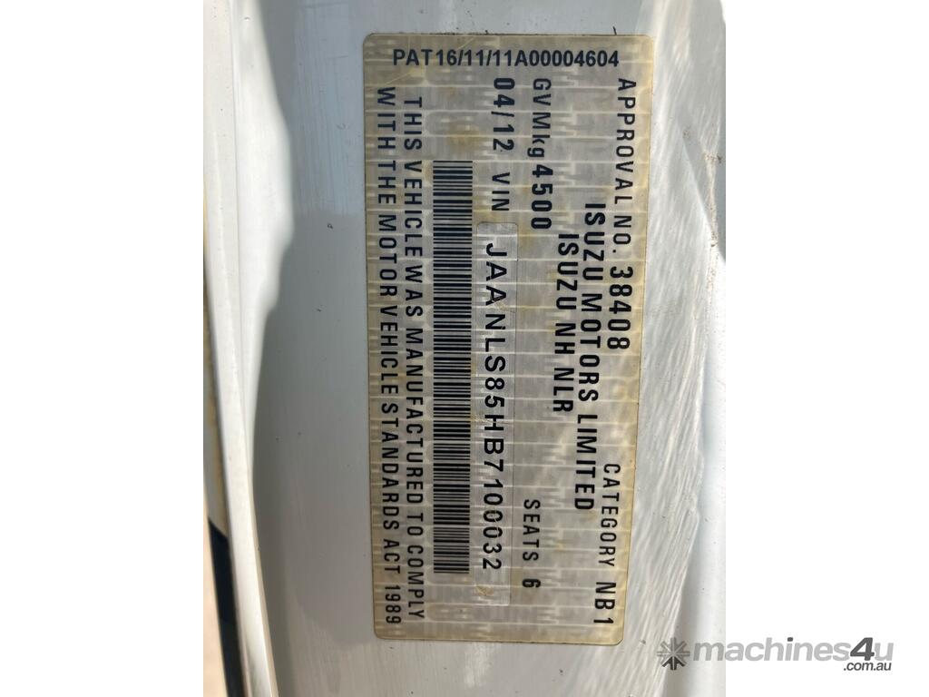 CP: 04/2012,Isuzu,NLR,Crew Cab Tray,Manual,Leaf Spring Rear Suspension ,Diesel,5 Gears,Odometer not visible,Hourmeter not visible,Colour: White,Unregistered NSW,VIN: JAANLS85HB7100032,Length: 6.4 m,GVM: 4500,GCM: 7000,Sold with No Plates,WOVR Status: WOVR N/A,Incident Type: Not Applicable