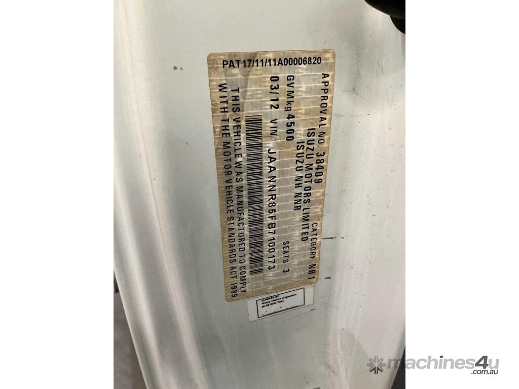 CP: 03/2012,Isuzu,NNR 200 Short,Fridge Pantech,Manual,Spring,Engine #: 4JJ1231066,LFB/4JJ1,4 Cyl,Diesel,5 Gears,454564 (Kms. Showing on Odometer),Hourmeter not visible,Colour: White,Unregistered,VIN: JAANNR85FB7100173,Key No: 51,Length: 5.5 m,GVM: 4500,GCM: 8000,Sold with No Plates,Key No: 51