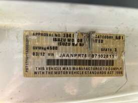 CP: 03/2012,Isuzu,NPR 200,Refrigerated Pantech,Manual,Spring,4 Cyl,Diesel,5 Gears,503609 (Kms. Showing on Odometer),Hourmeter not visible,Colour: White,Rego. No: NP(256SLO), Unregistered QLD,VIN: JAANPR75HB7102811,Key No: 230,GVM: 4500,GCM: 8000,Sold with No Plates,Key No: 230
