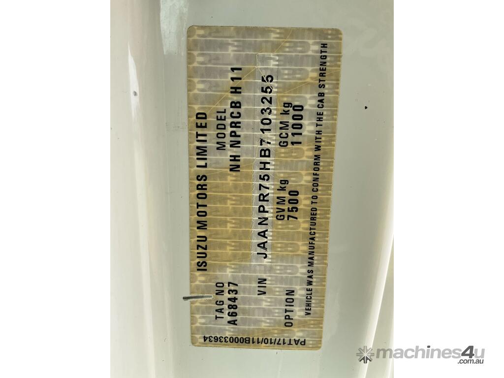 CP: 09/2012,Isuzu,NPR,Service Body,Manual,Spring,Diesel,Turbo,6 Gears,276695 (Kms. Showing on Odometer),Hourmeter not visible,Colour: White,Rego. No: NP(XP34ID), Unregistered NSW,VIN: JAANPR75HB7103255,Length: 6.2 m,GVM: 7500,GCM: 11000,Sold with No Plates