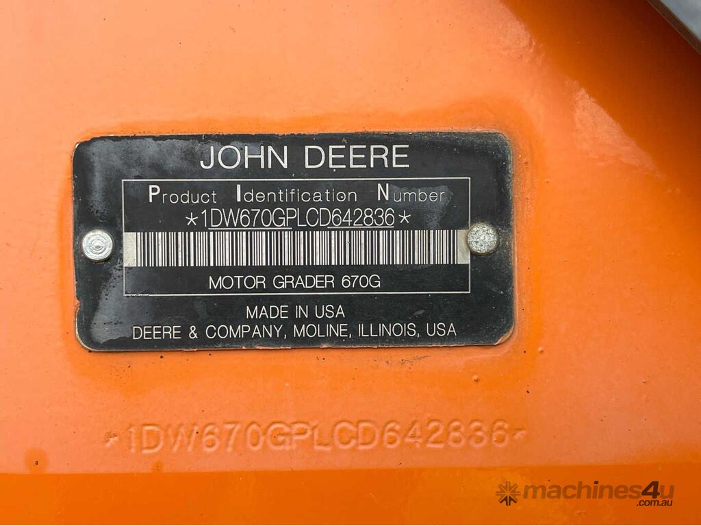 CP: CIRCA 2012,John Deere,670 GP,Grader,Engine #: RG6090L110981,6 Cyl,Diesel Turbo,Odometer not visible,6207 (Hrs. Showing on Hour meter),Colour: Orange,Unregistered,VIN: 1DW670GPLCD642836,Sold with No Plates