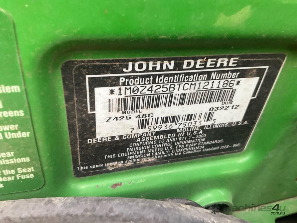 CP: CIRCA 2012,John Deere,Z425,Zero Turn Ride On Mower,2 Cyl,Petrol - Unleaded ULP,Odometer not visible,842 (Hrs. Showing on Hour meter),Colour: Green,Unregistered,Serial No: 1M0Z425BTCM121186,Sold with No Plates