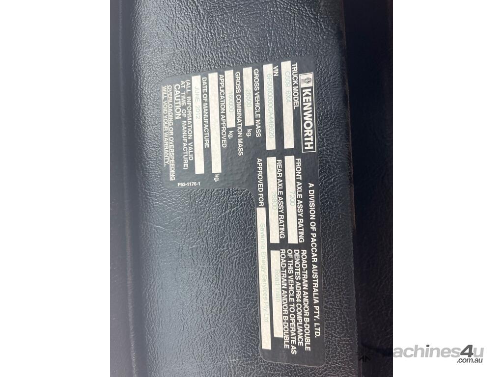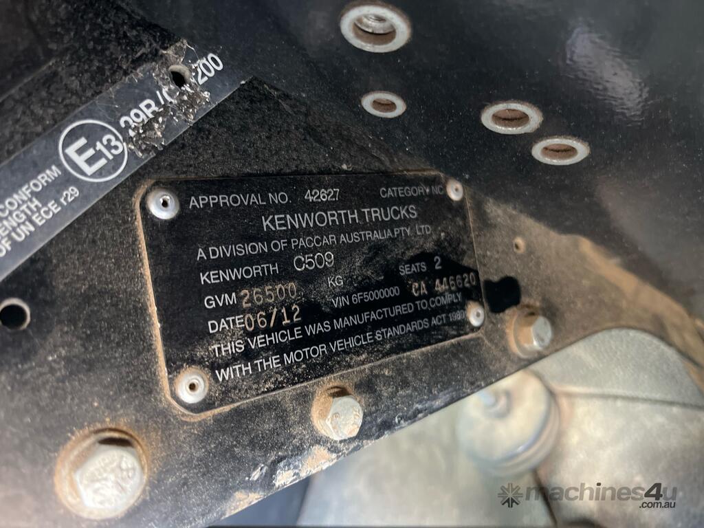 CP: 06/2012,Built: 06/2012,Kenworth,C509,Prime Mover,Manual,Spring,Cummins ISX,6 Cyl,Diesel,18 Gears,Odometer not visible,Hourmeter not visible,Colour: White,Unregistered,VIN: 6F5000000CA446620,GVM: 26500,GCM: 160000,Sold with No Plates,WOVR Status: WOVR N/A