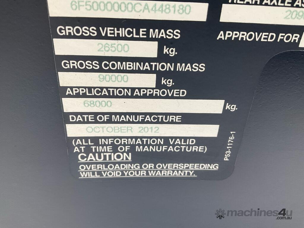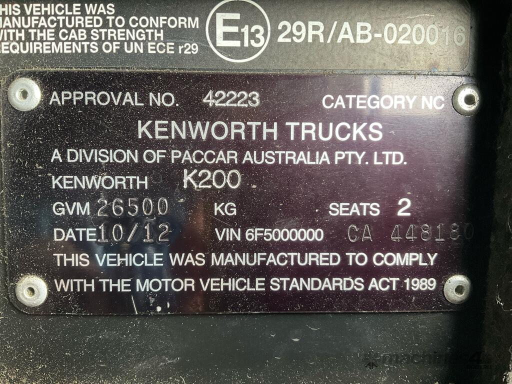 CP: 10/2012,Kenworth,K200 Series,Prime Mover Sleeper Cab,Manual,Airbags ,Engine #: 79597685,Cummins ,6 Cyl,Diesel Turbo,18 Gears,33729 (Kms. Showing on Odometer),24879 (Hrs. Showing on Hour meter),Colour: White,Unregistered,VIN: 6F5000000CA448180,Key No: 391E,Length: 6.8 m,GVM: 26500,GCM: 90000,Sold with No Plates,Key No: 391E