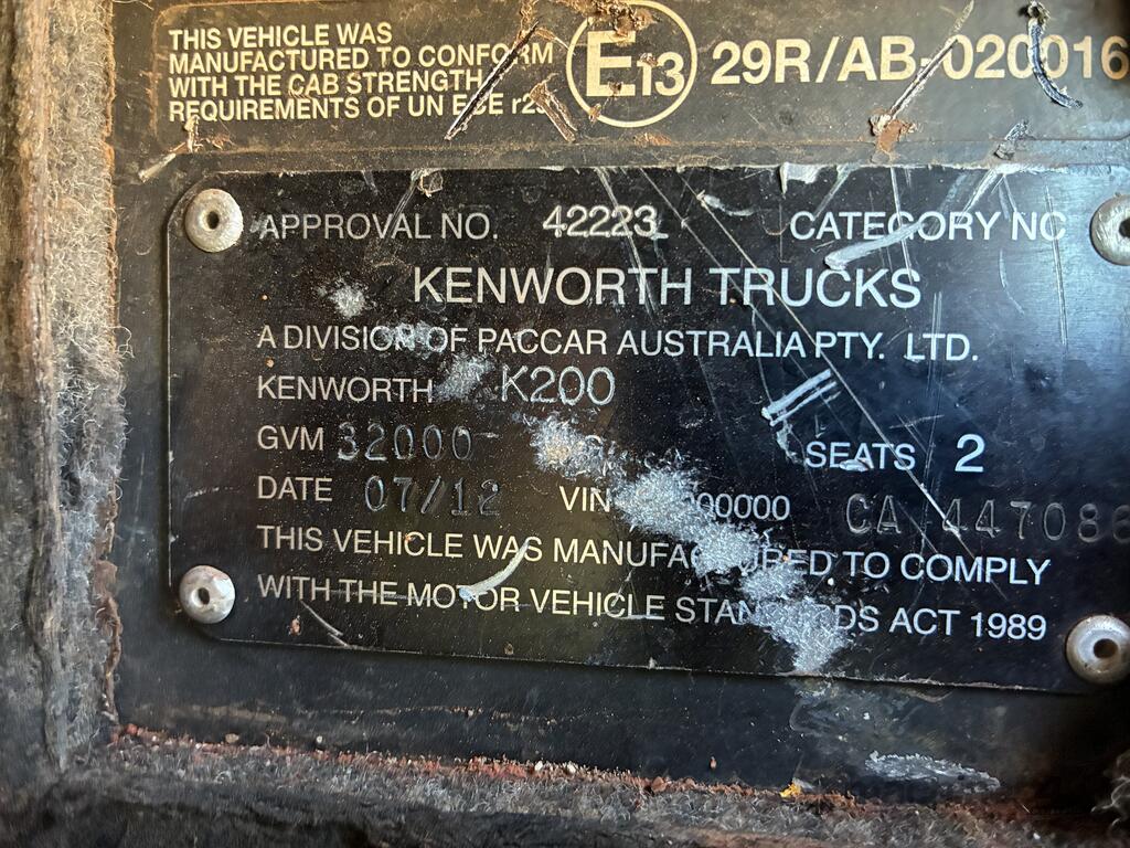 CP: 07/2012,Kenworth,K200 Series,Prime Mover Sleeper Cab,Automatic,Cummins,6 Cyl,Diesel,1123856 (Kms. Showing on Odometer),22320 (Hrs. Showing on Hour meter),Rego. No: BM34958 WA,VIN: 6F5000000CA447086,GVM: 30000,GCM: 155000,Sold with No Plates