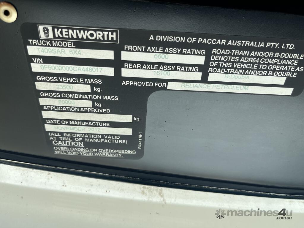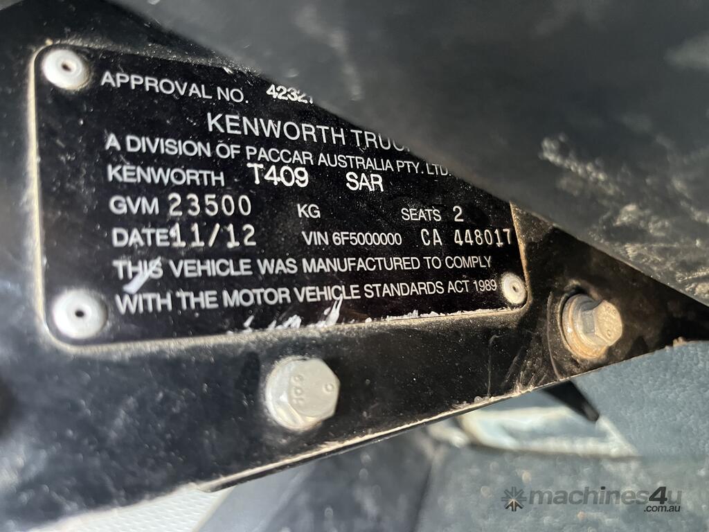 CP: 11/2012,Kenworth,T409SAR,Prime Mover Day Cab,Automatic,Airbag,Engine #: 79601036,Cummins ISX ADR80/03,1730075 (Kms. Showing on Odometer),29249 (Hrs. Showing on Hour meter),Colour: White,Rego. No: NP(XB73PM), Unregistered,VIN: 6F5000000CA448017,GVM: 23500,GCM: 70000,Sold with No Plates