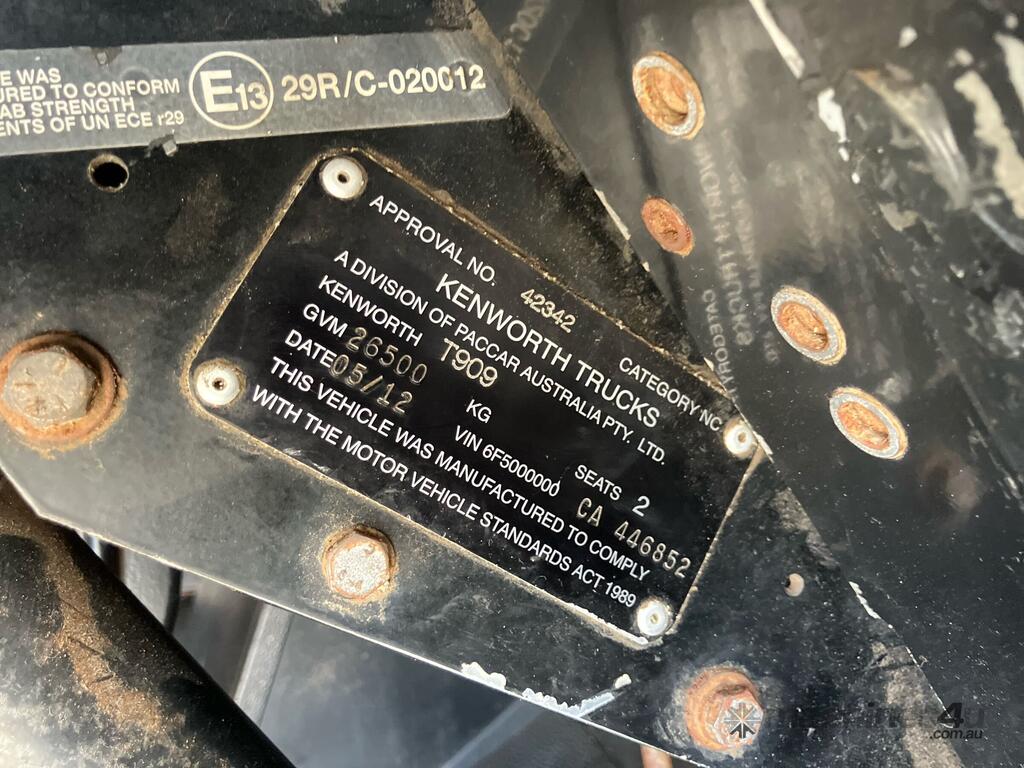 CP: 05/2012,Kenworth,T909,Prime Mover,Manual,Airbag Suspension,Cummins X15 550 HP,14.9 Ltr,6 Cyl,Diesel Turbo,18 Gears,912362 (Kms. Showing on Odometer),16575 (Hrs. Showing on Hour meter),Colour: White,Rego. No: NP(879RXW), Unregistered QLD,VIN: 6F5000000CA446852,GVM: 26500,GCM: 140000,Sold with No Plates