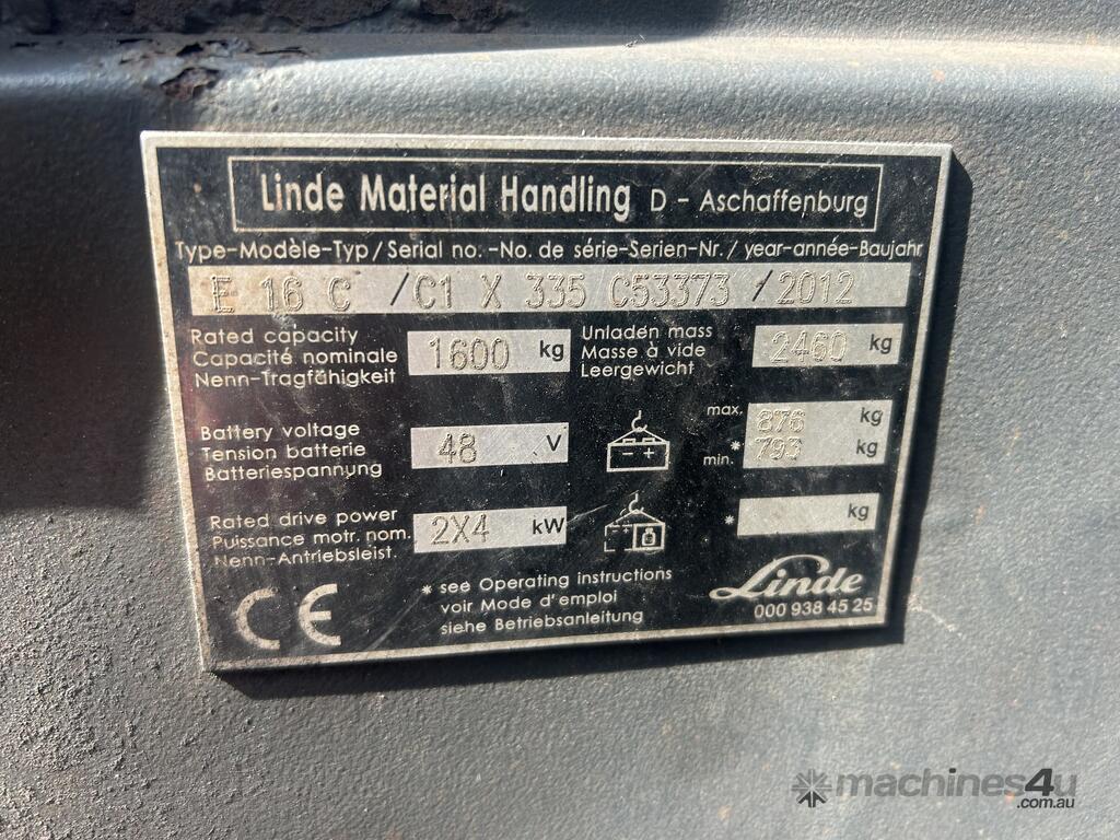 CP: CIRCA 2012,Linde,E16C,Forklift,Electric,Odometer not visible,10031 (Hrs. Showing on Hour meter),Colour: Red,Unregistered,Serial No: C1 X 335 C53373,Sold with No Plates,Key No: 146