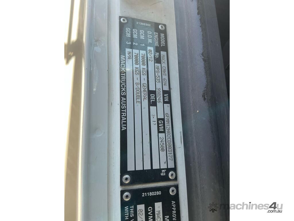 CP: 02/2012,Mack,CMHT Trident,Prime Mover Day Cab,Automatic,Airbag Suspension,Engine #: 980246,Mack MP8-535,6 Cyl,Diesel,465309 (Kms. Showing on Odometer),24314 (Hrs. Showing on Hour meter),Colour: White,Rego. No: NP(XW04NA), Unregistered,VIN: 6FMM12H02CD803177,Key No: 179,GVM: 24500,GCM: 70000,Sold with No Plates,Key No: 179